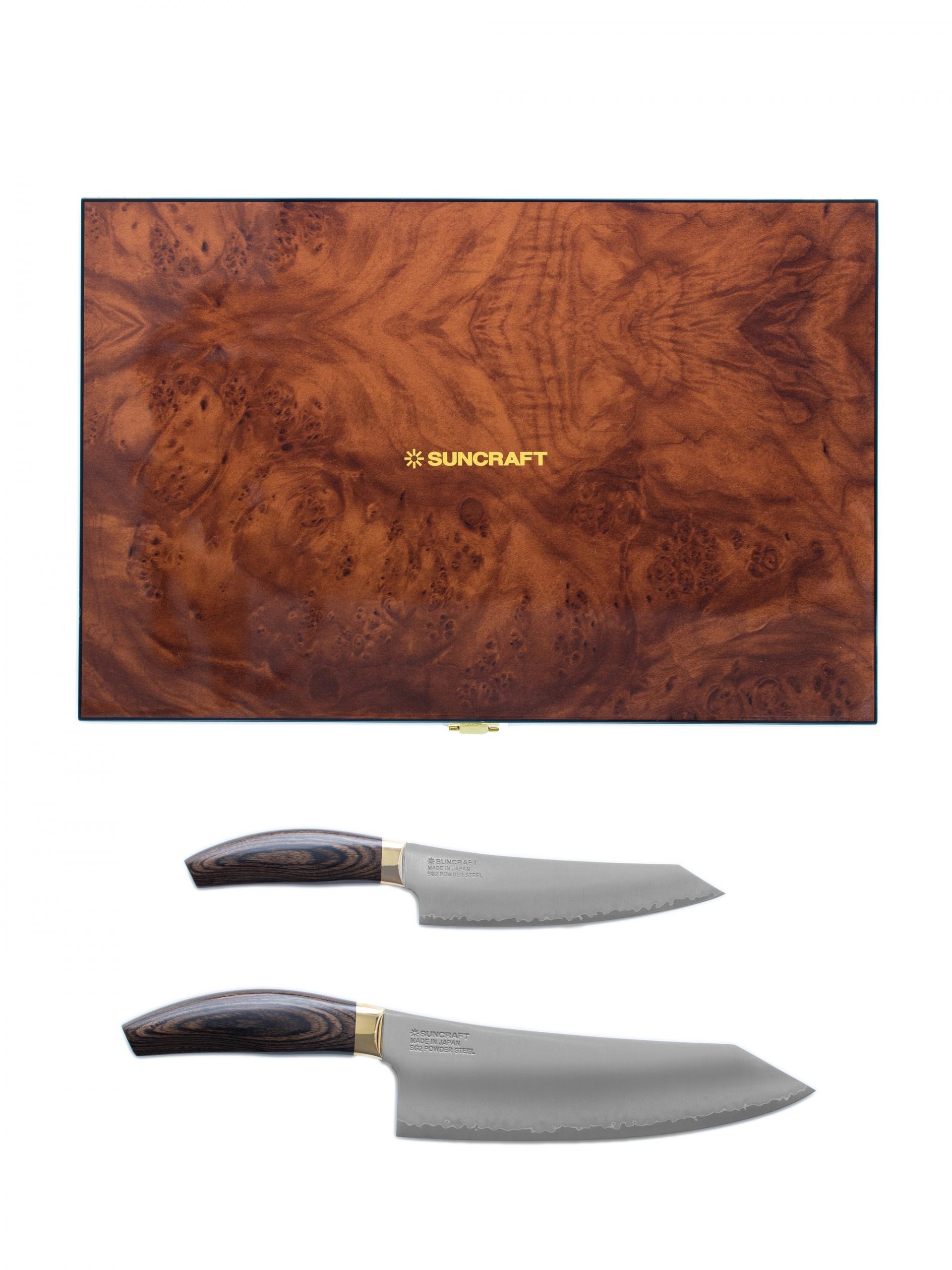 Upea veitsisarja upeassa säilytyslaukussa. Sarjassa kaksi huippuluokan kokkiveistä. Suncraft Elegancia veitset valmistetaan SG2-teräksestä. Sitä pidetään maailman parhaana veitsiteräksenä ja on kovuudeltaan 62-63 HRC. Elegancia kahva on pähkinäpuukuvioitua pakkapuuta.